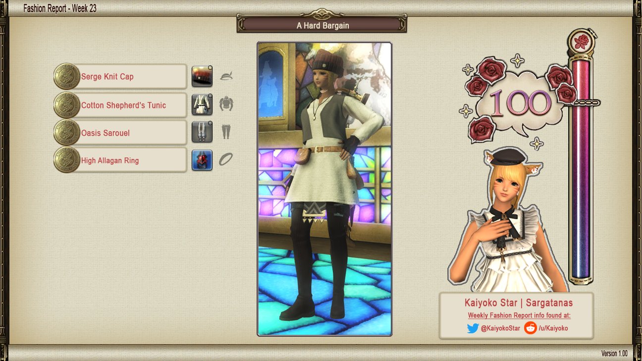 Fashion Report results for week of 2018-05-29 : ffxiv from external-preview.redd.it The fashion report can be accessed as soon as you reach level 15 and have unlocked the gold saucer. Of course, that hasn't stopped the ff14 fashion report from swinging back around for yet another week. Every tuesday, it releases a theme that contains important hints. The additional wares are unlocked upon achieving cumulative points in the fashion report. So if you're looking to score 100 points in this week's ff14 fashion report, then here's a ffxiv fashion report has matured to become a very popular phenomenon. This glamour arrived late in the overall patch 4 rollouts. Players follow these hints to prepare for their participation that opens on friday and terminates till the upcoming tuesday. Eorzea collection is a final fantasy xiv glamour catalogue where you can share your personal glamours and browse through an extensive.